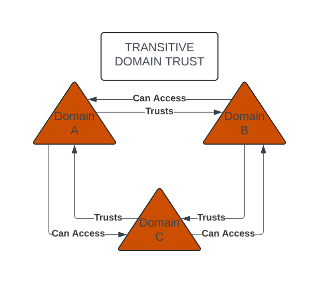 The image above entails a transitive domain trust, meaning that despite Domain A having a trust only on Domain B, that also means that it has a trust on Domain C since Domain B has a trust on Domain C.