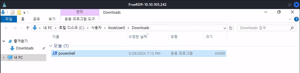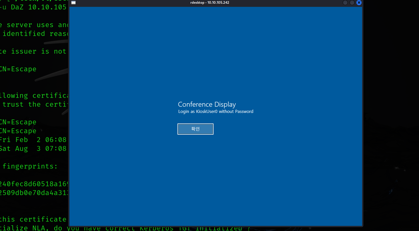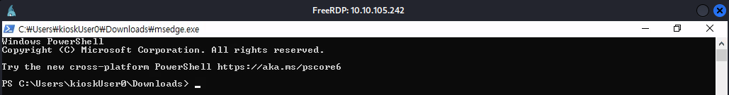 Given the result of the conference display, we are told to authenticate to this machine with the user KioskUser0 without a password. We’ll use xfreerdp /v:10.10.105.242 /u:KioskUser0 to authenticate to this machine properly.