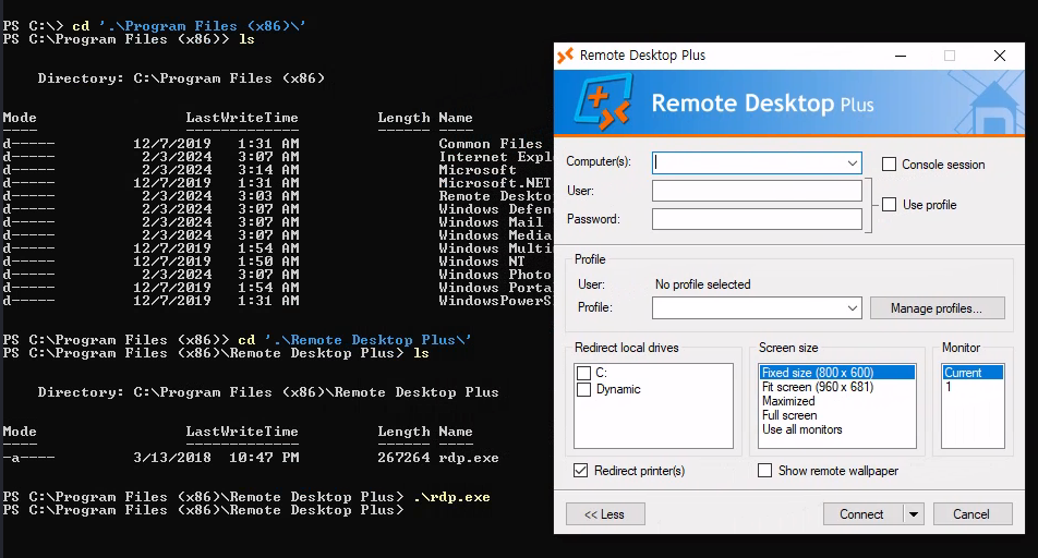 Though we aren’t able to open it from here, we should be able to access the binary from within the PowerShell window we have right now. It’s within C:\Program Files(x86)\Remote Desktop Plus.