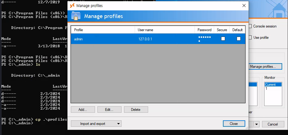 That is until I realized the one thing we can do, which is within Manage profiles.... We don’t have any profiles at first in the window that pops up, but it does allow us to import profiles based on a respective profile file. We did have one before for the admin user, so let’s try to import that. Note that you’ll need to move the profiles.xml file to a place you can actually access, which I moved to the Downloads folder and then imported from there.