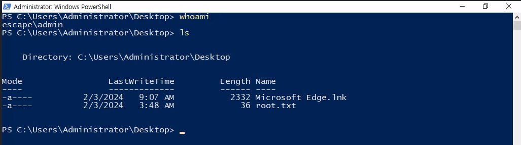 PS C:\Users\kioskUser0\Downloads> runas /user:ESCAPE\admin C:\Windows\System32\WindowsPowerShell\v1.0\powershell.exe |