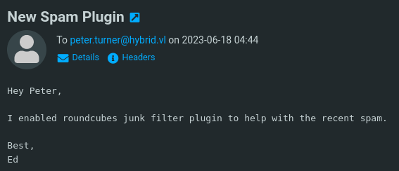 Upon looking around, I’ve stumbled across an email that admin has sent to peter.turner, entailing that they’ll be enabling a Junk plugin on the Roundcube server.