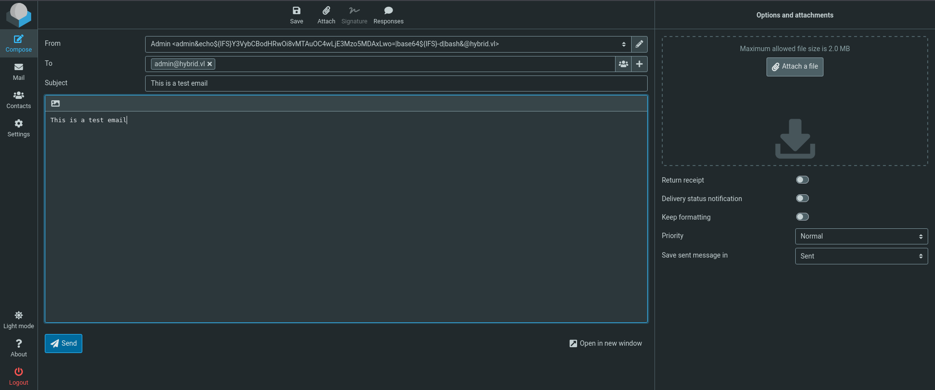 Let’s compose an email now and send it back to ourselves to exploit the plugin. (All I did was compose an email and send it to admin@hybrid.vl).