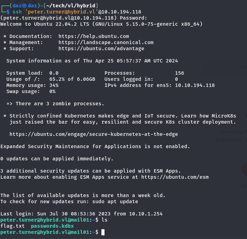 Upon testing these credentials to SSH on the machine, we can see that we have access through SSH as peter.turner@hybrid.vl. Slight note, my IP address did change since I took a break in between doing this.