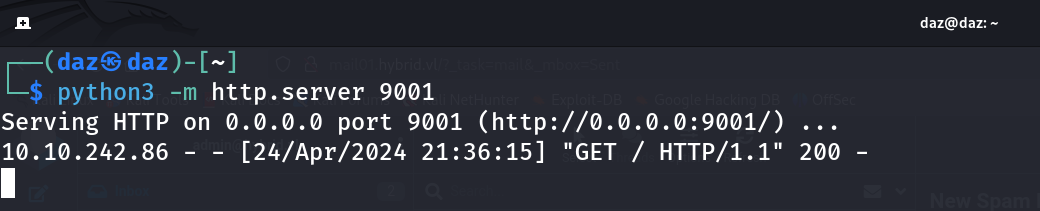 Additionally, on my local machine, I’ll start a simple python server on port 9001 to receive the request. python3 -m http.server 9001