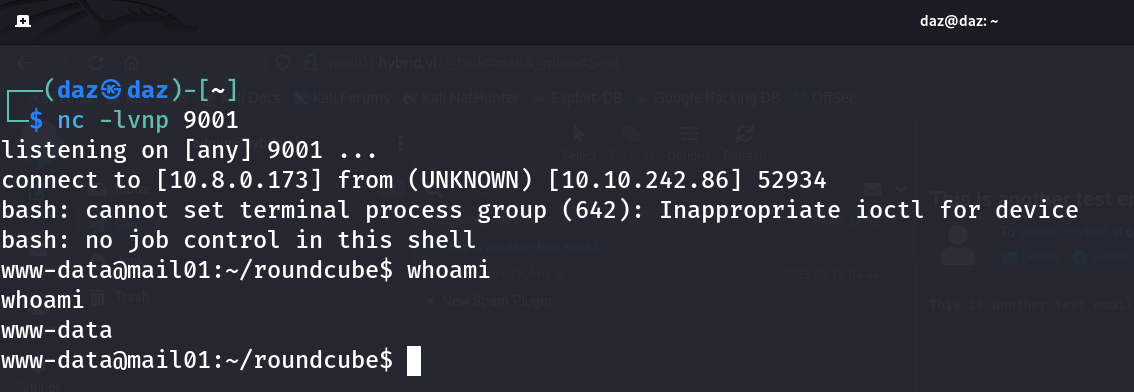 If we do all of the same steps as outlined previously and use the Junk plugin in a new email, we can see that a reverse shell was spawned as user wwwdata.