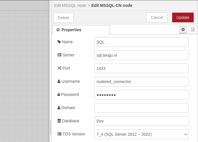 If we remember originally from the start of the box, there was an MSSQL node that was failing from one of the flow diagrams in Node-RED. If we take a look back at this, we can edit the SQL node information and we’ll find the same nodered_connector auto-filled into the credential option for this node. Entering our creds into this will cause the node error to disappear after deploying the diagram.