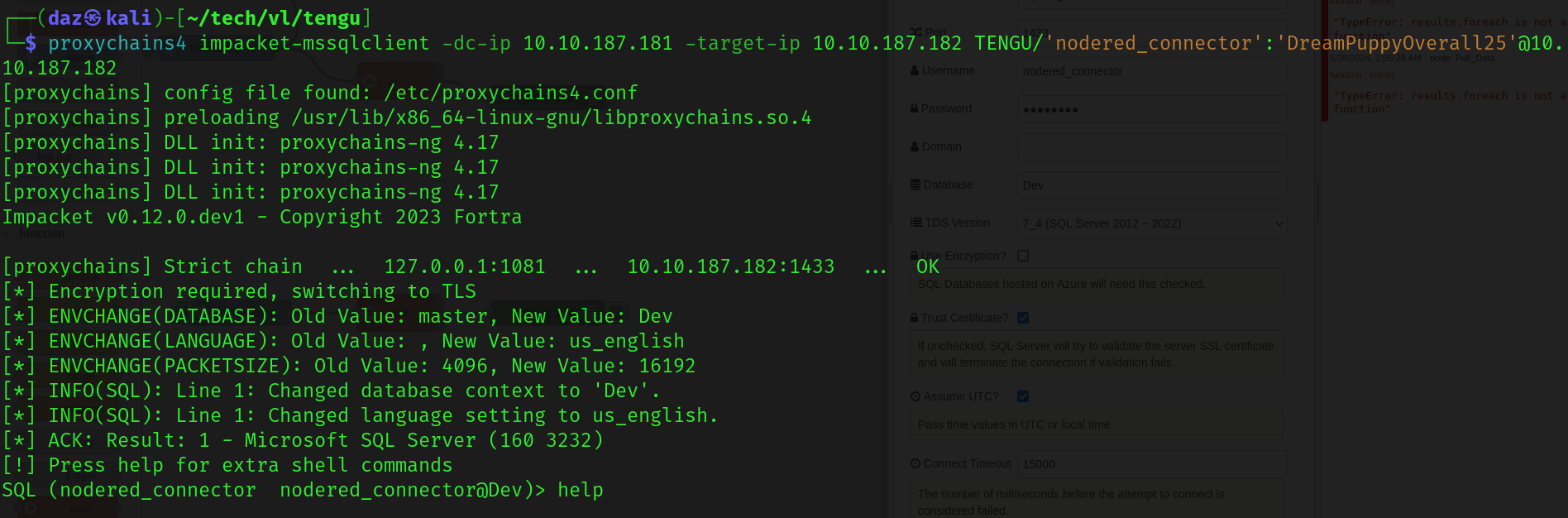 └─$ proxychains4 impacket-mssqlclient -dc-ip 10.10.187.181 -target-ip 10.10.187.182 TENGU/'nodered_connector':'[...snip...]'@10.10.187.182 |