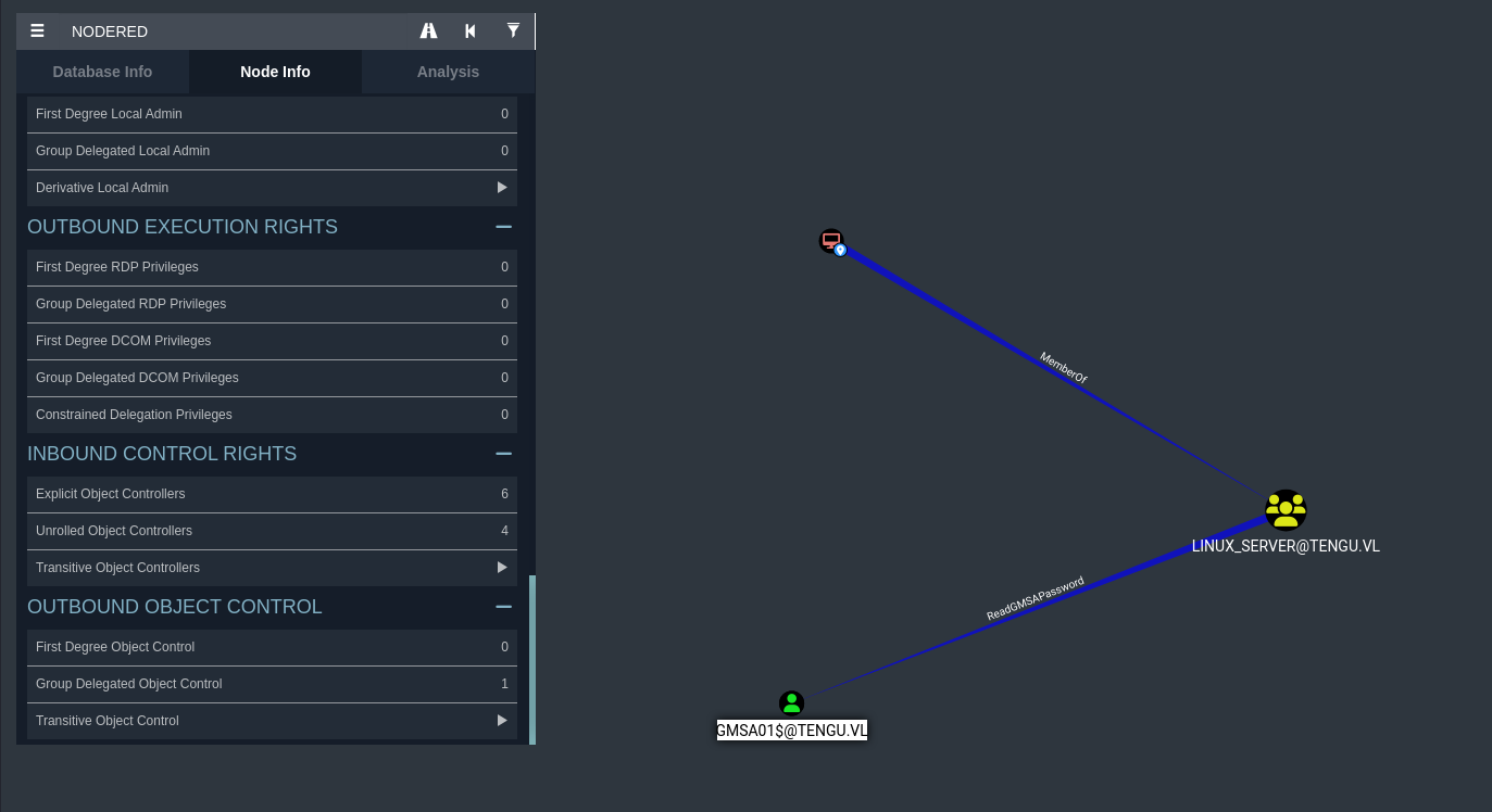It seems that our machine account NODE-RED$ is a part of the LINUX_SERVER domain group, which has ReadGMSAPassword over GMSA01$@tengu.vl. This essentially means that we can read the respective password for this user as our NODERED$ machine account. We can do so with crackmapexec.