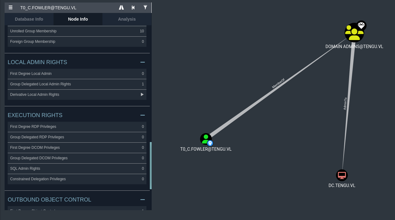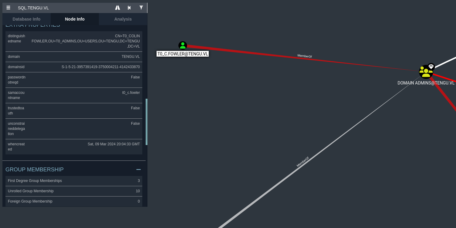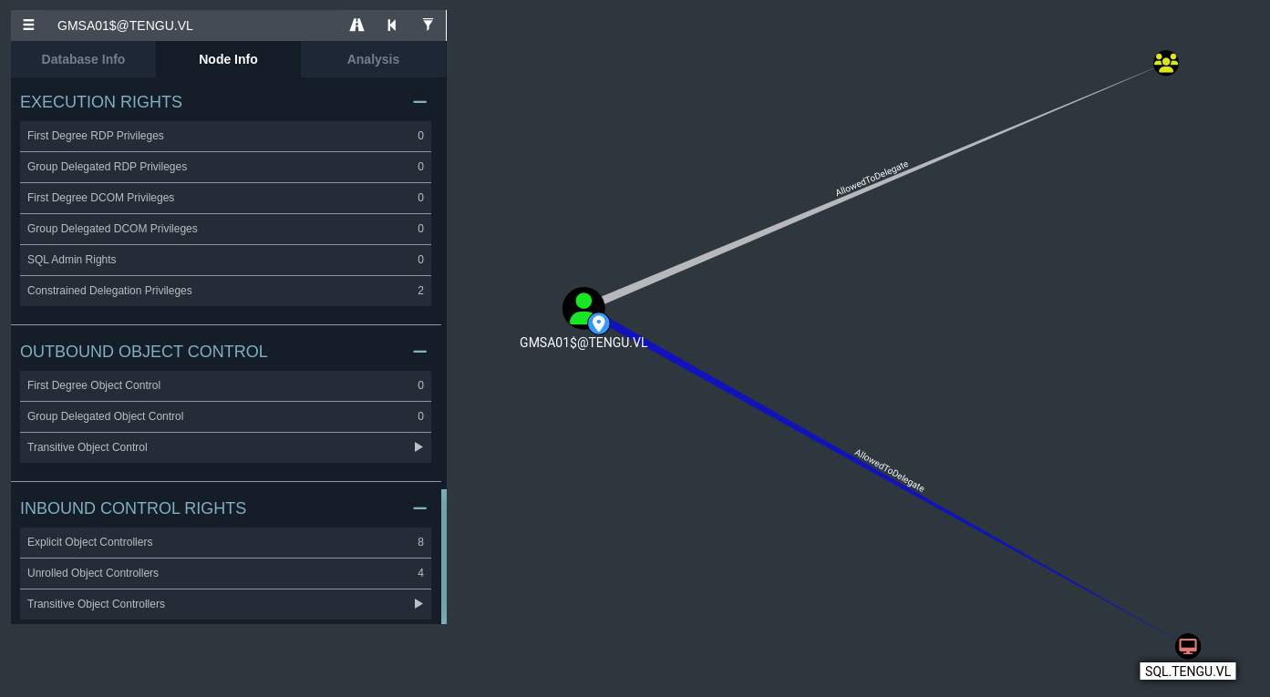 Our user GMSA01$, has constrained delegation rights on the SQL machine, sql.tengu.vl. This means that we are allowed to authenticate as any user to specific services (more than likely MSSQL in our case) onto this machine. We can also impersonate domain admins, meaning that we can potentially compromise this entire host just from this privilege.