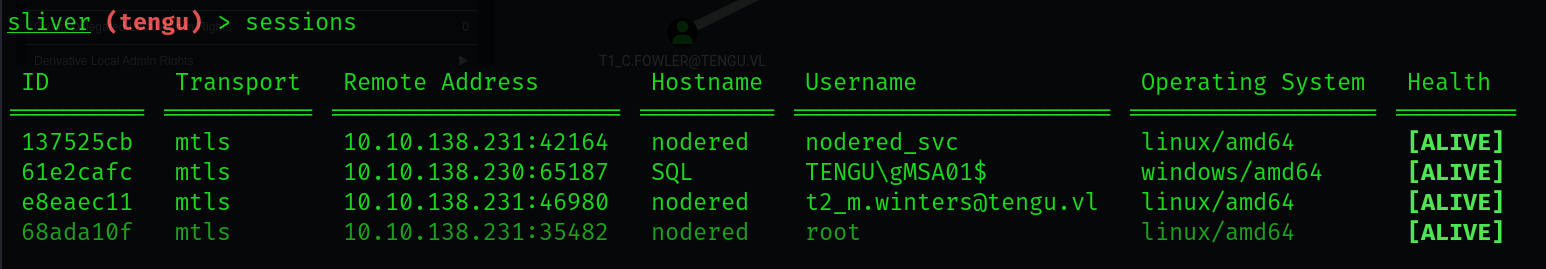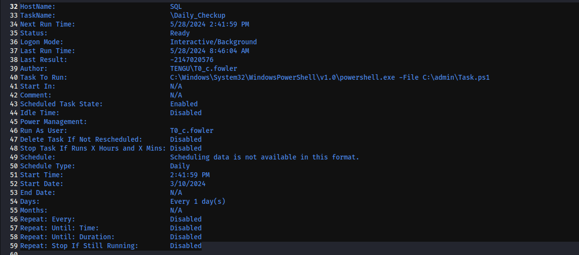 There’s a task file denoted as C:\admin\Task.ps1 that seems to be ran as t0_c.fowler, which is the user we are trying to escalate as. If we plant a reverse shell or attempt to execute our Sliver binary, we should be able to get a session as this user once this task is executed. (I just added Start-Process "C:\temp\sql_tengu.exe" to the bottom of the file.)