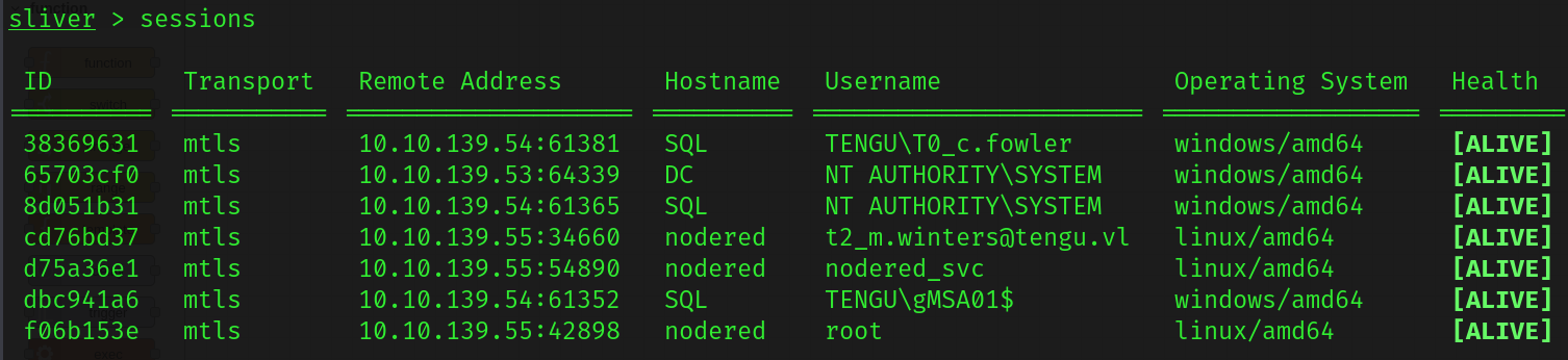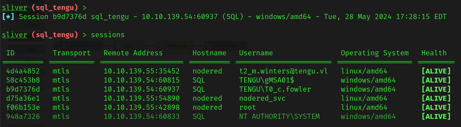 If you’ll notice, this user has SeImpersonatePrivilege, meaning we can impersonate SYSTEM and spawn a named pipe onto PowerShell, which we can then run our sql_tengu binary again to get a session as SYSTEM. We’ll use SharpEfsPotato for this and can get a SYSTEM shell relatively easily. Note that I tried doing this through Sliver’s UI, and was running into a token error. I dropped it locally to sql.tengu.vl and it seemed to work as intended.