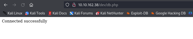 Let’s run a gobuster scan against /dev to see if we can find this database connection.gobuster dir -u http://10.10.155.38/dev -w /usr/share/dirbuster/wordlists/directory-list-2.3-medium.txt -x 'php'