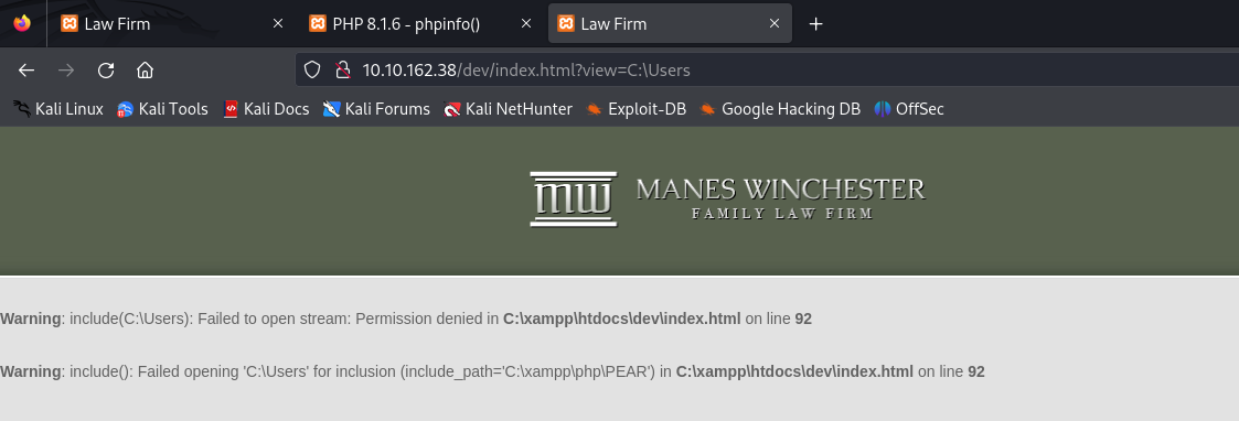Let’s test this out on that contact.html page we were referring to earlier. We’ll try to access C:\Users to determine if we can see the list of all users we can log onto. (Remember, this is a Windows machine, otherwise on Linux we would just dump /etc/passwd.)http://10.10.162.38/dev/index.html?view=C:\Users