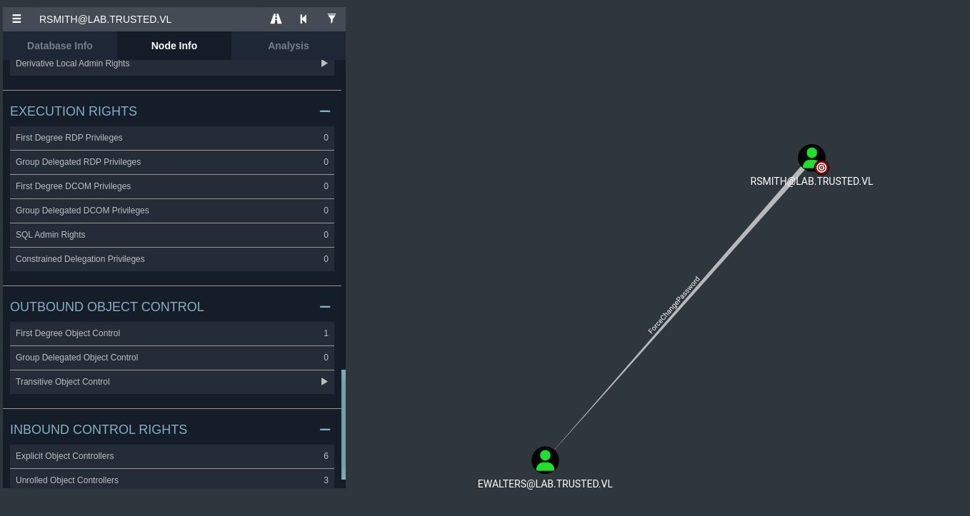 After uploading the zip folder to Bloodhound, let’s search up the domain object for rsmith@lab.trusted.vl. After selecting Node Info, we can see that rsmith has an1 outbound object control.