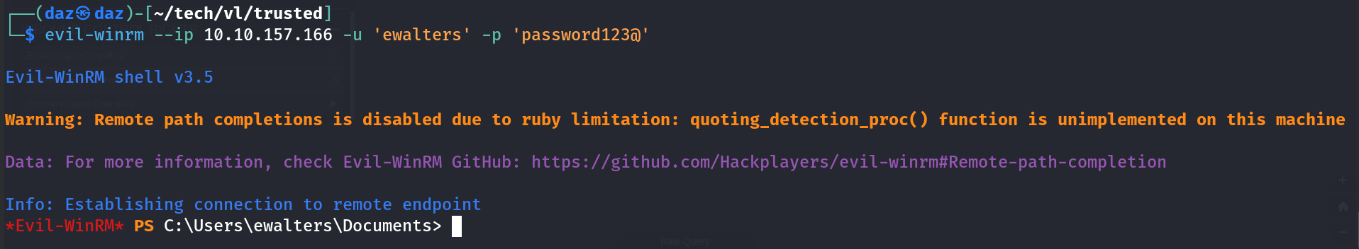 evil-winrm --ip 10.10.157.166 -u 'ewalters' -p 'password123@'