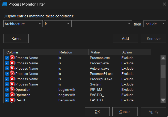 Process Name - contains - Kaspersky -> then IncludePath - ends with - .dll -> then Include