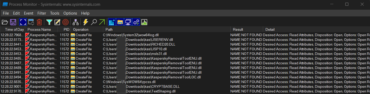 There are a numerous amount of DLLs that are executed within the same directory as the binary (my binary is located in Downloads\kas\). This presents us with a vulnerability that is also new for my research - DLL Hijacking.
