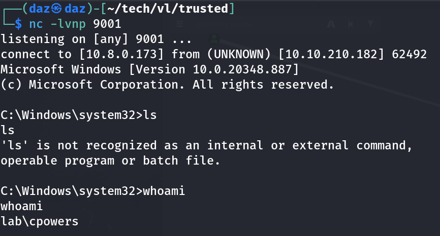 This will open up a remote shell through PsExec on the TRUSTEDDC domain controller a SYSTEM, meaning we have completed this chain! Is what I hoped.