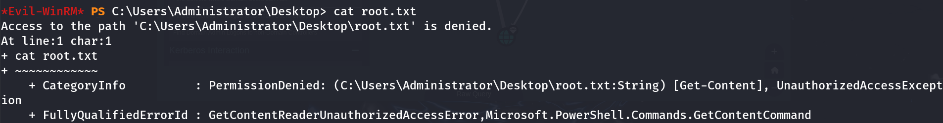 My guess is that there are privileges that restricting us from accessing this file, meaning we need to use . To save some time (in the screenshot above as you’ll notice), I used mimikatz to dump the Administrator hash and log-in with it through WinRM, however this STILL did not let us access the file.