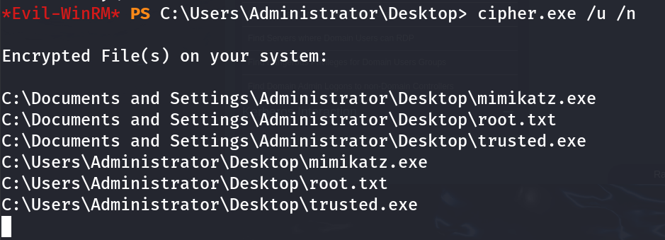 If you run cipher /u /n on the machine, you’ll notice that the root flag is encrypted with EFS.