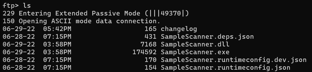 NOTE: Remember to set your FTP session to “binary” mode before you download all of the files. This just makes sure to change all of the downloads from ASCII to Binary, which will convert the SampleScanner.exe to an MS-DOS which we won’t be able to debug later. You can do so easily by typing binary into the FTP console.