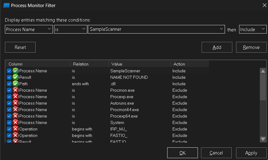 - Process Name - begins with - SampleScanner -> then Include