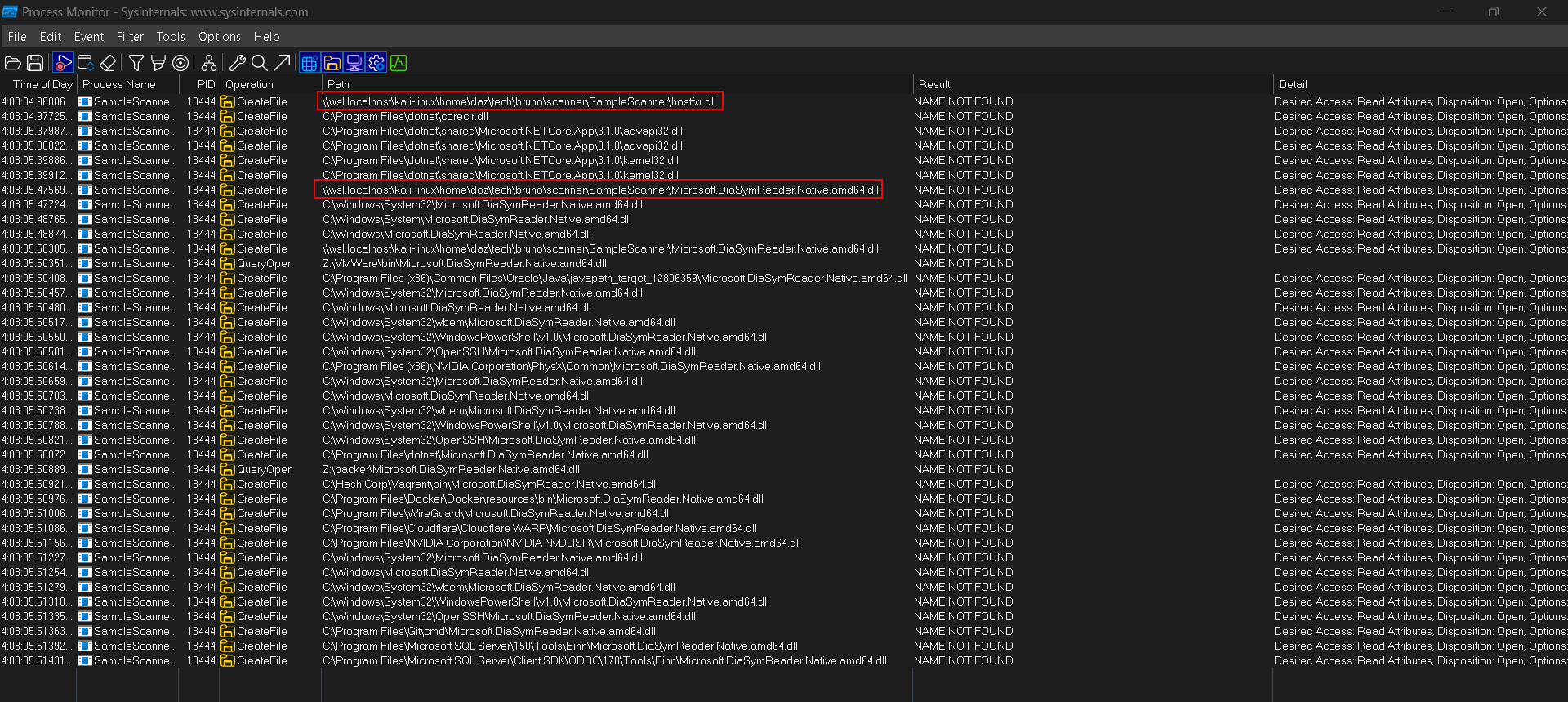 You’ll get a lot of results, so I’ve highlighted two important entries that get logged into ProcMon. The two highlights I have are DLLs that are not found within the current directory. The key note here is that they are DLLs that are within the current directory, meaning it will be using the same directory that the SampleScanner application is within.