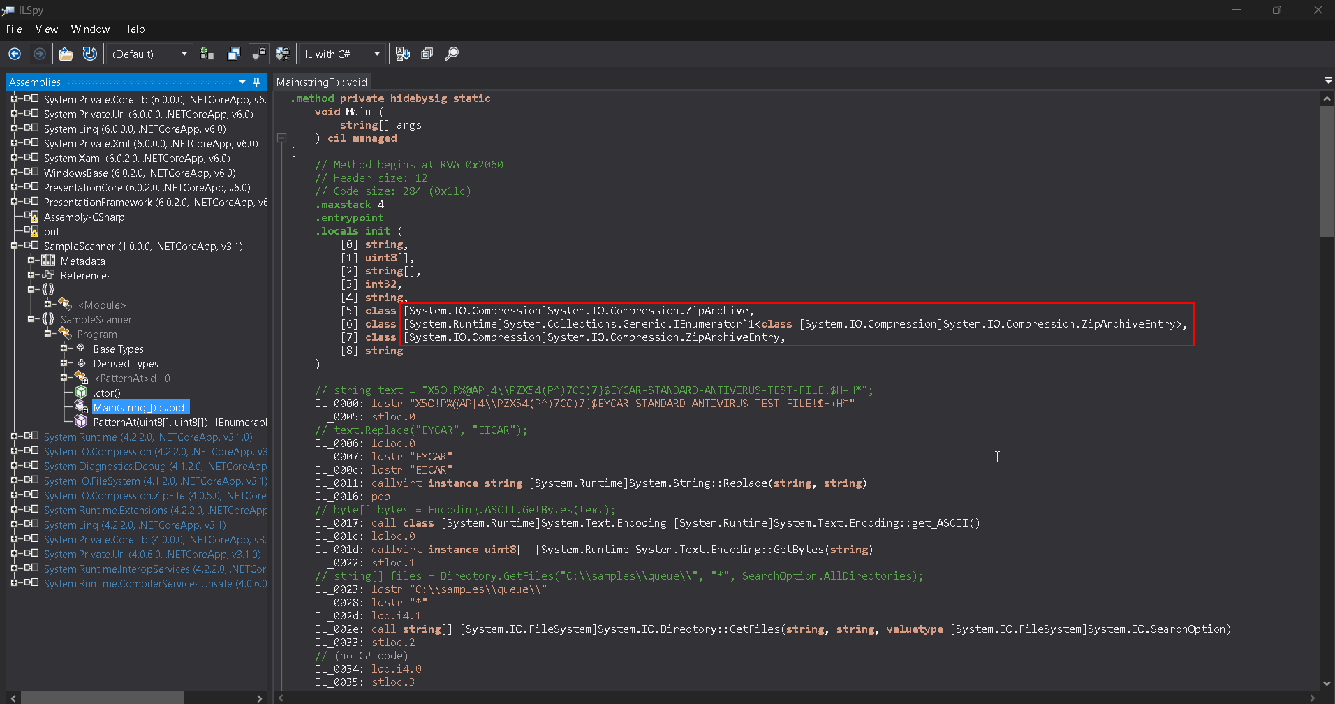 Looking into those classes, it looks like the zip archive is opening the archive itself with GetEntry and get_ArchiveReader. These contents are then scanned by the application itself to simulate a malware scan.