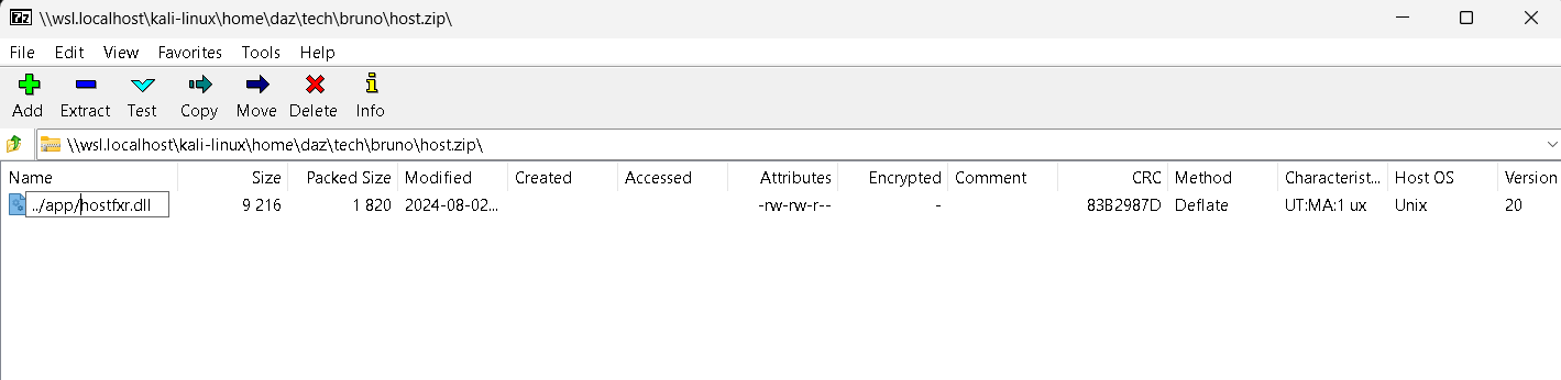Since we know the names of the DLL that are not found within the application’s direct path, we can use those as the names for our malicious DLLs. We can craft a malicious DLL using msfvenom, as seen below and then convert it to a zip archive. You can use either hostfxr.dll or Microsoft.DiaSymReader.Native.amd64.dll, as either will work for this.